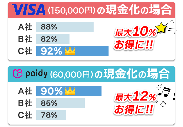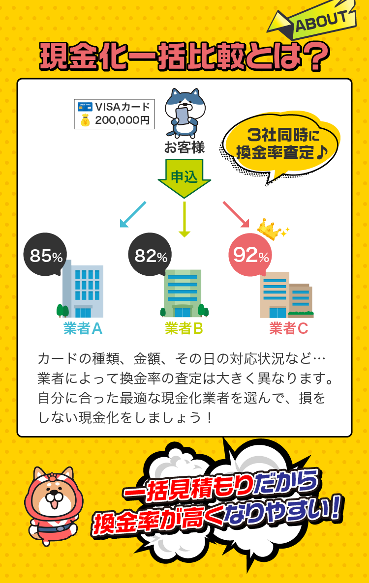 「クレジットカード現金化一括比較」は、現金化サービス各社の換金率・振込スピード・手数料・口コミなどをもとに、独自の調査とユーザーアンケートにより優良店のみをご紹介するサイトです。