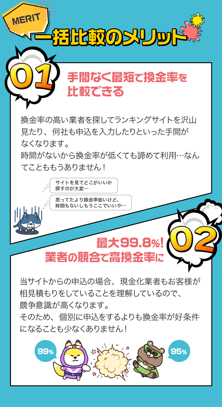 当サイトでは、お客様の申込で条件に合う優良な現金化業者を最大3社に絞り込み、お客様の情報を共有します。共有された3社それぞれから、お客様に直接ご連絡(電話またはメール)が届きます。それらの見積もりを比較するだけで、自分で複数の業者を調べて申し込む手間なく、最も条件の良い業者を選ぶことができます。