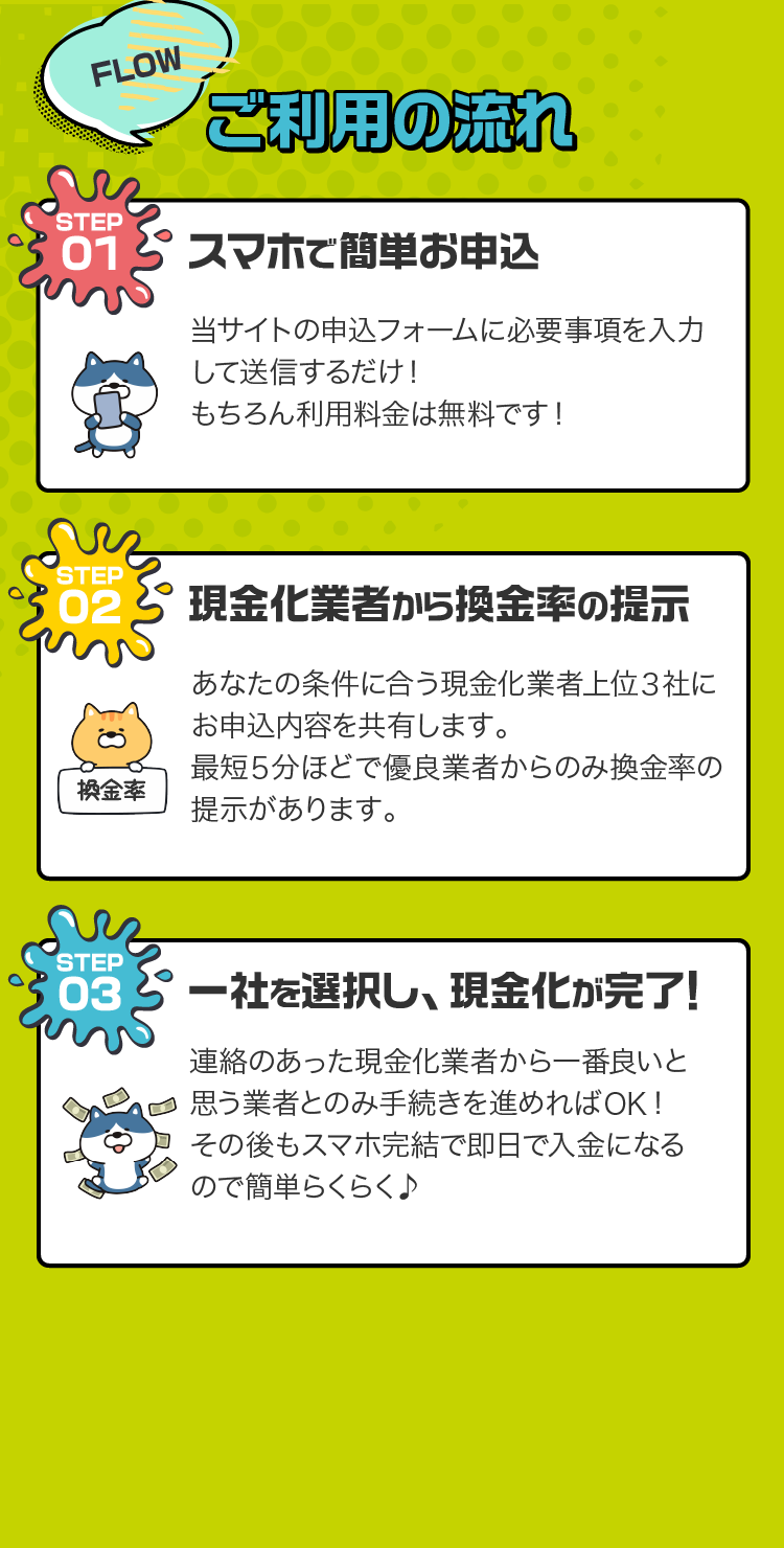 お客様が当サイトのフォームに入力された個人情報は、厳重なセキュリティ体制のもとで管理され、選定された最大3社の現金化業者のみに共有されます。